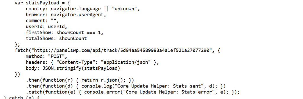 A teljes képernyős iframe alatt egy beillesztett JavaScript található, amely lenyomatot vesz a böngészőkről, nyelvi beállítások segítségével begyűjti a geolokációs adatokat, és az interakciós naplókat olyan parancs- és vezérlő (C2) domaineknek továbbítja, mint például a panelswp[.]com és dragonshop[.]cloud.