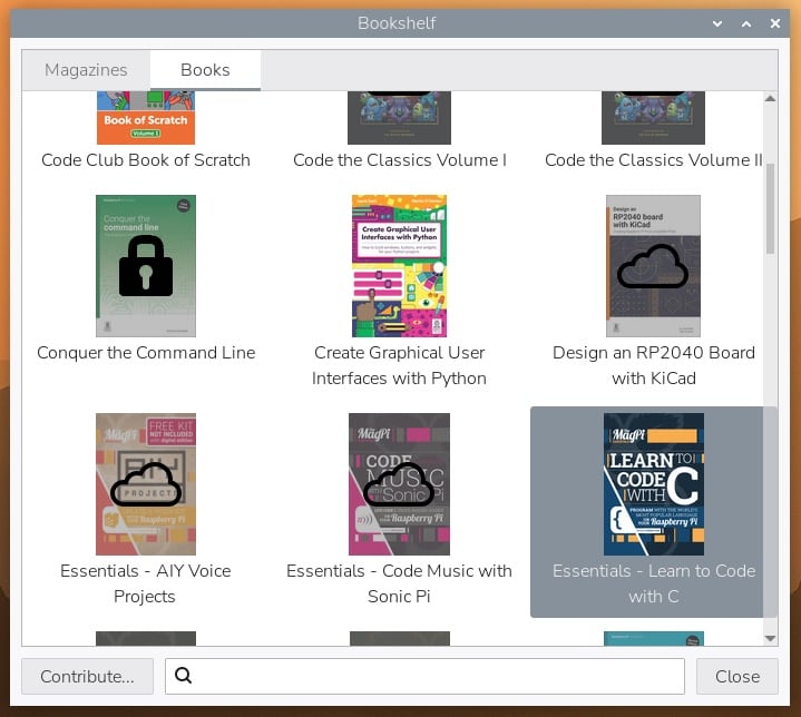A Bookshelf alkalmazás is megújult. A pandémia idején bevezetett eszköz eredetileg a Raspberry Pi Press ingyenes elektronikus kiadványait tette könnyen hozzáférhetővé. Mostantól azonban a legfrissebb számok először a Raspberry Pi hivatalos magazin előfizetői számára érhetők el, majd néhány hónappal később válnak mindenki számára szabadon letölthetővé. A nemrég megjelent kötetek lakat ikonnal jelennek meg az alkalmazásban, jelezve, hogy azok később válnak elérhetővé. Az előfizetők a „Contribute” gomb segítségével bejelentkezve azonnal hozzáférhetnek a teljes kínálathoz.
