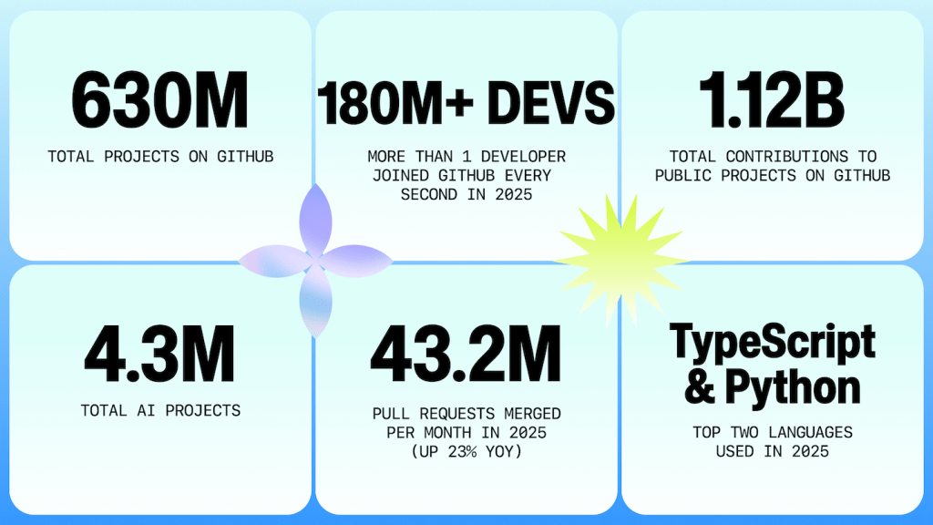 A Python, amely továbbra is az AI és az adattudomány gerince, 850 000 új fejlesztőt vonzott (+48% éves növekedés), míg a JavaScript 427 000-rel (+25%) gyarapodott. Együttesen a TypeScript és a Python ma már több mint 5,2 millió GitHub-felhasználót fed le – ez a teljes fejlesztői közösség körülbelül 3%-át jelenti.